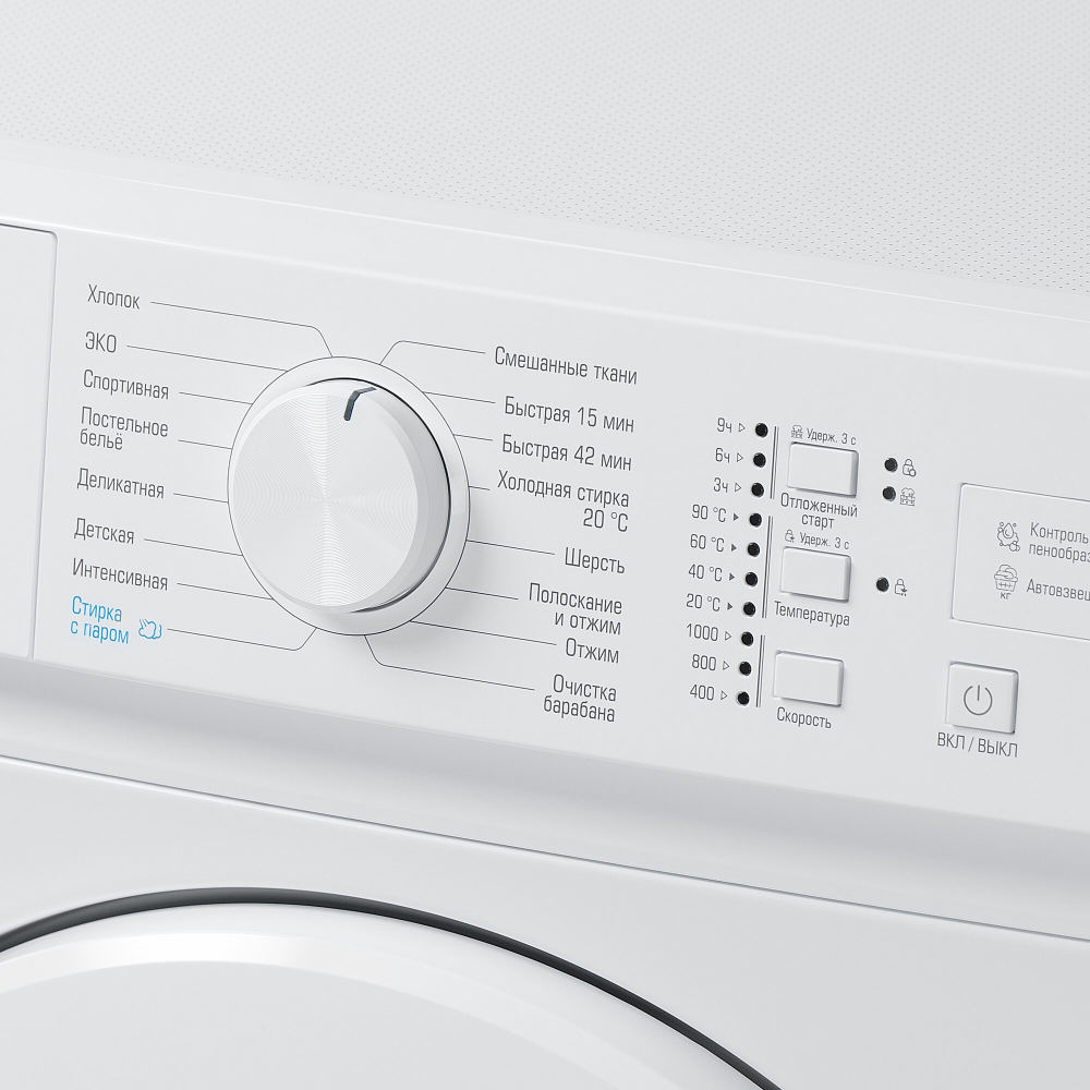 | Дополнительные функции | Автовзвешивание, выбор скорости отжима, выбор температуры стирки, контроль баланса, отложенный старт, очистка барабана |